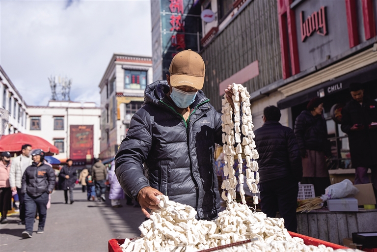 在拉薩市城關區(qū)八廓商城,絨布燙金的藏式對聯、色彩艷麗的“羅薩梅朵”……花樣繁多的各類年俗用品與傳統年貨吸引了眾多市民群眾前來選購。