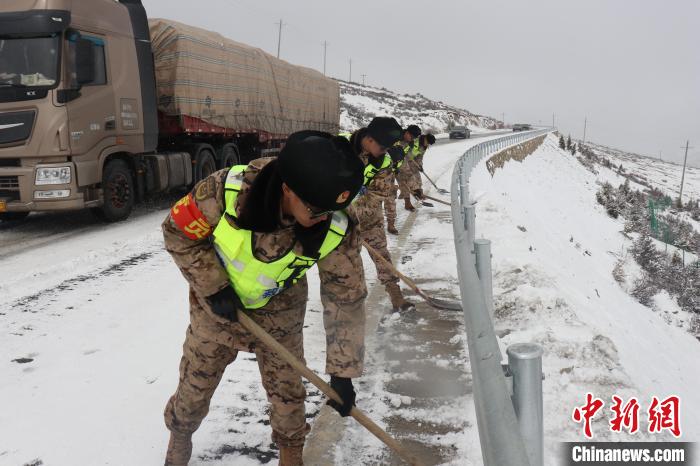 在嚴(yán)寒天氣里,武警官兵克服高寒缺氧的惡劣環(huán)境,累計清雪5500余立方米,解救滯留車輛200余輛,恢復(fù)道路暢通。