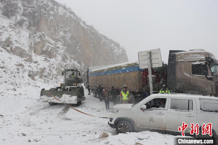 據(jù)了解,災(zāi)情發(fā)生后,擔(dān)負該路段養(yǎng)護保通任務(wù)的武警第二機動總隊某支隊官兵迅速啟動道路除雪保通預(yù)案,抽組專業(yè)救援力量及大型救援裝備趕赴受阻路段實施搶通。受阻路段平均海拔處于4000米以上,持續(xù)降雪不斷,官兵們首先對滯留人員進行安撫,并發(fā)放食物和藥品等救援物資,為盡快清理路面積雪,官兵采取“機械協(xié)同先通后擴、人機配合高效救援”的方式同步展開作業(yè)。期間,一輛重載半掛車不慎陷入邊溝中,指揮員果斷調(diào)整方案,封控現(xiàn)場、撒布融雪劑、清理四周積雪、鋼絲繩牽引等步驟緊張有序的進行中……伴隨著發(fā)動機的轟鳴聲,車輛被成功救出。