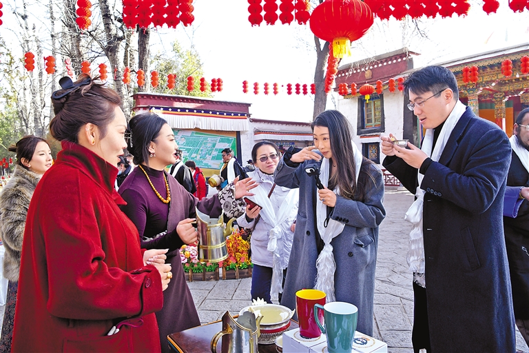 隨著一聲聲“扎西德勒!”“新年快樂(lè)!”的祝福語(yǔ)響起,身著盛裝的工作人員站在切瑪盒旁邊,熱情地教游客吃“切瑪”?!扒鞋敗焙欣餄M滿的青稞粒和糌粑,再加上金燦燦的酥油花和染成紅綠兩色的“羅薩梅朵”麥穗的裝點(diǎn),象征著五谷豐登、福澤綿長(zhǎng)。來(lái)自廣東的游客張女士一家是專程趕來(lái)過(guò)藏歷新年的,想來(lái)體驗(yàn)不同年味兒的她輕捏一撮切瑪撒向空中:“愿我們?nèi)医】灯桨玻沧W鎳?guó)繁榮昌盛!”