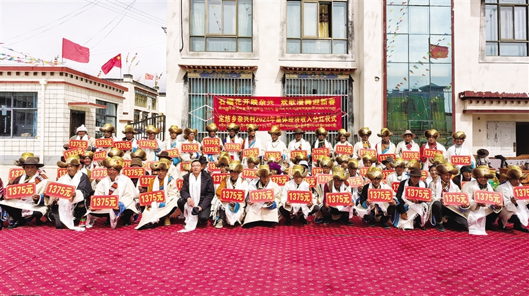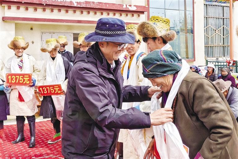 “羅薩扎西德勒!這是您家的分紅款!”定結鄉(xiāng)黨委副書記、鄉(xiāng)長高文雄為75歲的村民央金遞上分紅紅包并表達自己的祝福。長桌上,“卡賽”、青稞酒擺成“豐收塔”;長桌旁,8.8萬元分紅款化作“新年紅包”,村民們揣著紅包看表演,共同分享村集體經(jīng)濟發(fā)展的豐碩成果,藏歷新年的喜慶與鄉(xiāng)村振興的碩果在此刻交融。