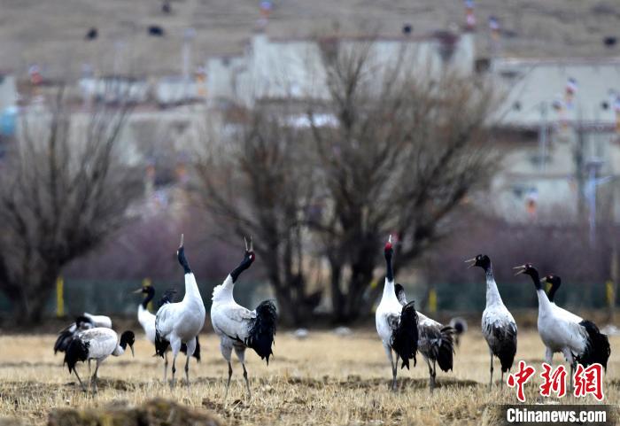 圖為3月8日,西藏拉薩林周縣黑頸鶴保護(hù)區(qū),黑頸鶴在田間覓食、嬉戲。中新社記者 李林 攝
