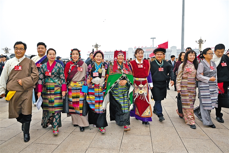 西藏全國人大代表滿懷信心步出會場。