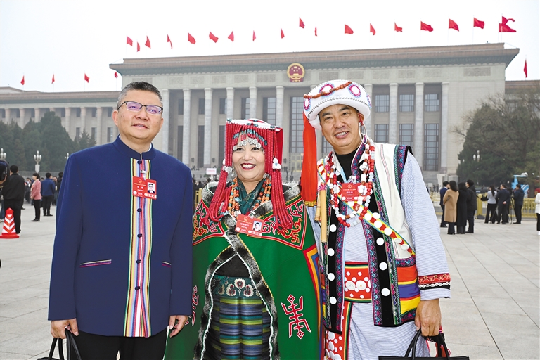 西藏全國人大代表格桑卓瑪(中)與云南省全國人大代表在人民大會堂前合影留念。記者 旦增西旦 攝