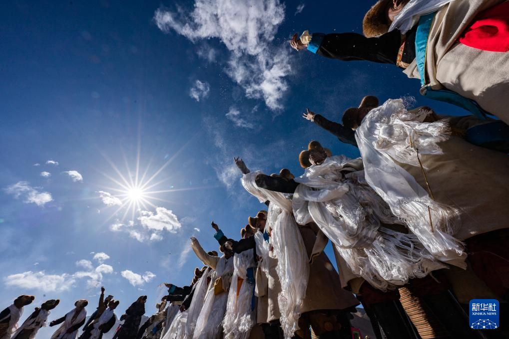 3月16日,在拉薩市林周縣春堆鄉(xiāng)春耕典禮現(xiàn)場(chǎng),農(nóng)機(jī)駕駛員向天空撒糌粑祈愿豐收。新華社記者 晉美多吉 攝