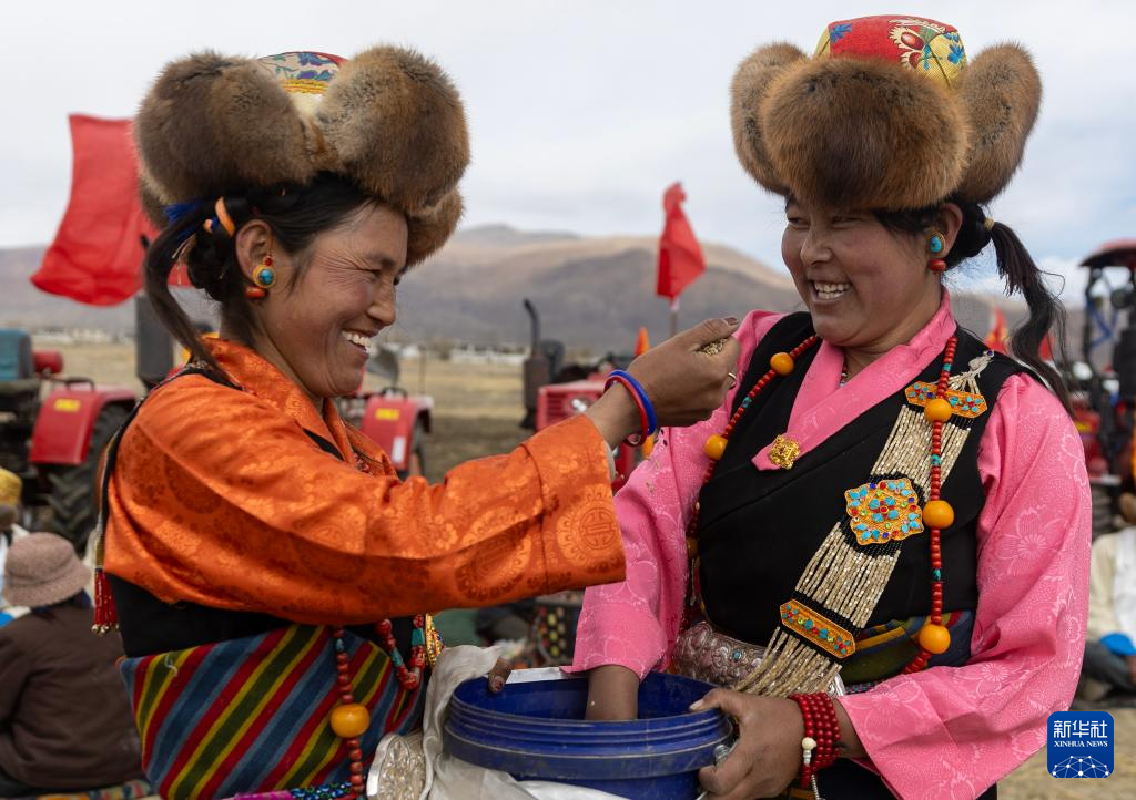 拖拉機(jī)作業(yè)結(jié)束后,大家圍坐在農(nóng)田之上,喝著青稞酒,跳著“拉孜堆諧”(拉孜地區(qū)特有的舞蹈),祈愿風(fēng)調(diào)雨順,五谷豐登。