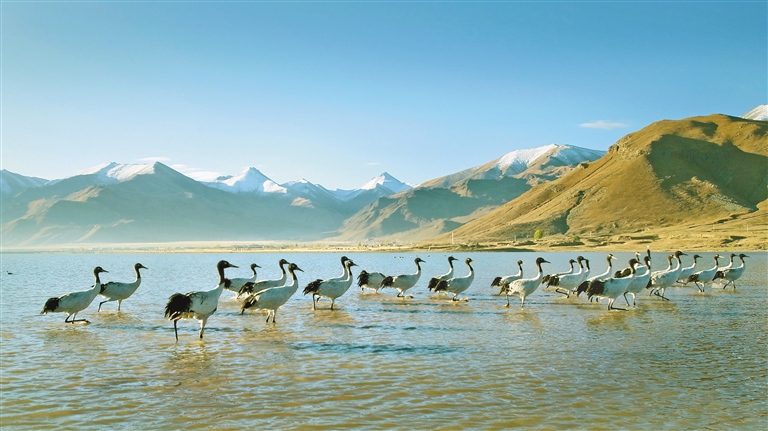 當(dāng)溫暖的陽光輕柔地灑在拉薩河谷,黑頸鶴清脆的鳴叫聲喚醒了林周濕地寧靜的清晨?!案5亓种堋Q鶴有鳴”生態(tài)藝術(shù)共享季之“冬游拉薩”宣傳推廣活動,以歌舞表演、生態(tài)主旨演講、黑頸鶴攝影作品展、鶴文化專家座談等,融合了生態(tài)、藝術(shù)與文化的盛宴,讓人在雪山、湖泊與鶴影交織的詩意中,感受“冬游拉薩”的獨特魅力。