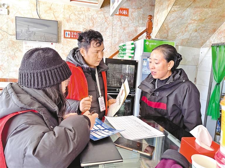 拉薩市城關(guān)區(qū)八一街道當熱社區(qū)組織開展食品安全隱患排查工作。這是工作人員在仔細檢查商戶營業(yè)執(zhí)照、食品衛(wèi)生許可證和健康證等持證情況。記者 王敏 攝