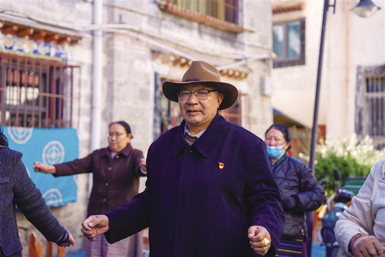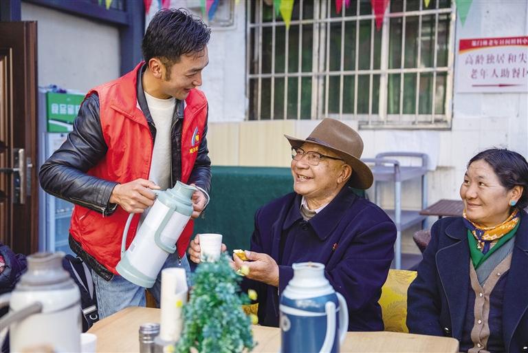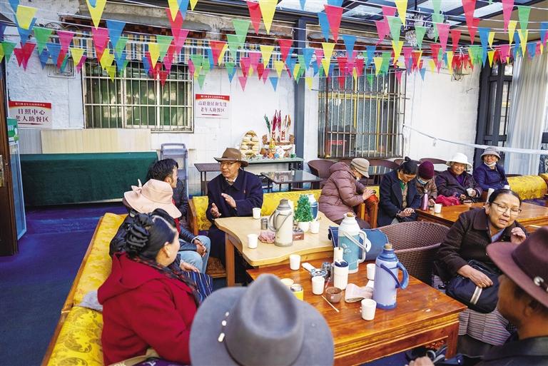 “波啦,您來啦,快坐下來喝點(diǎn)熱茶?!薄澳?,待會(huì)午飯?jiān)谶@邊吃嗎?”近日,記者來到拉薩市城關(guān)區(qū)蕃陽社會(huì)工作者和志愿者服務(wù)協(xié)會(huì)下的策門林老年日間照料中心,剛進(jìn)大門就被一群正在鍛煉身體的老人所吸引。他們跟著老師抬手、踢腿、扭腰,動(dòng)作整齊劃一,臉上洋溢著幸福的笑容。鍛煉結(jié)束后,赤來回到助餐區(qū),邊喝甜茶邊吃“卡賽”,和老人們分享趣聞,拉著家常,現(xiàn)場(chǎng)傳來一陣陣歡聲笑語。