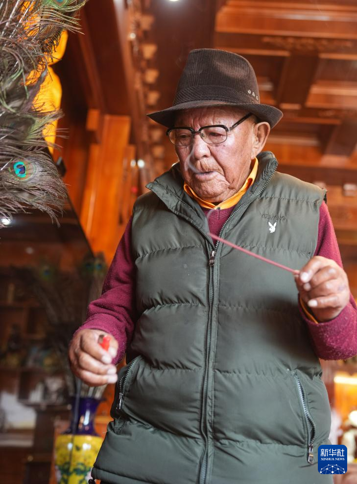 洛桑老人在家點藏香(3月20日攝)。新華社記者 晉美多吉 攝