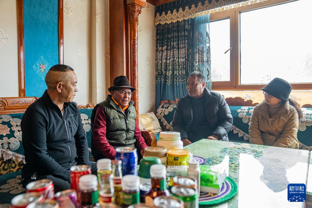 洛桑老人(左二)在家中和兒子及街坊聊天(3月20日攝)。新華社記者 丁增尼達 攝