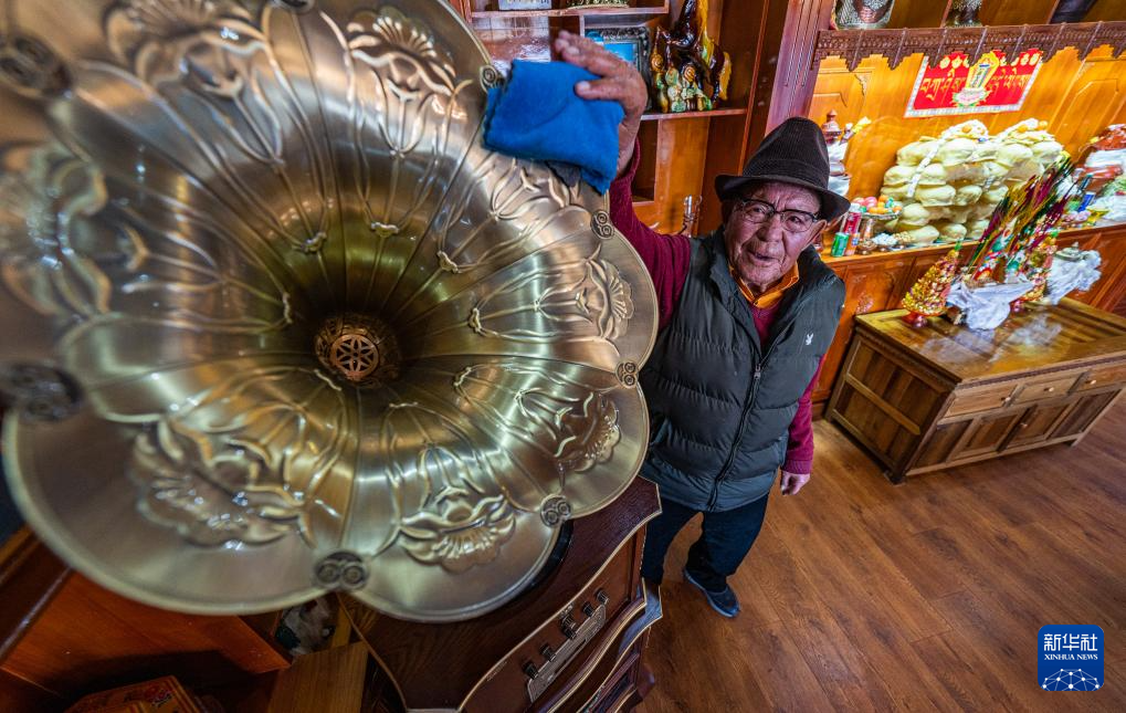 洛桑老人在家中擦拭留聲機(3月20日攝)。 新華社記者 丁增尼達 攝