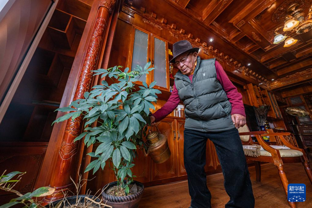 洛桑老人在家中澆綠植(3月20日攝)。新華社記者 丁增尼達 攝