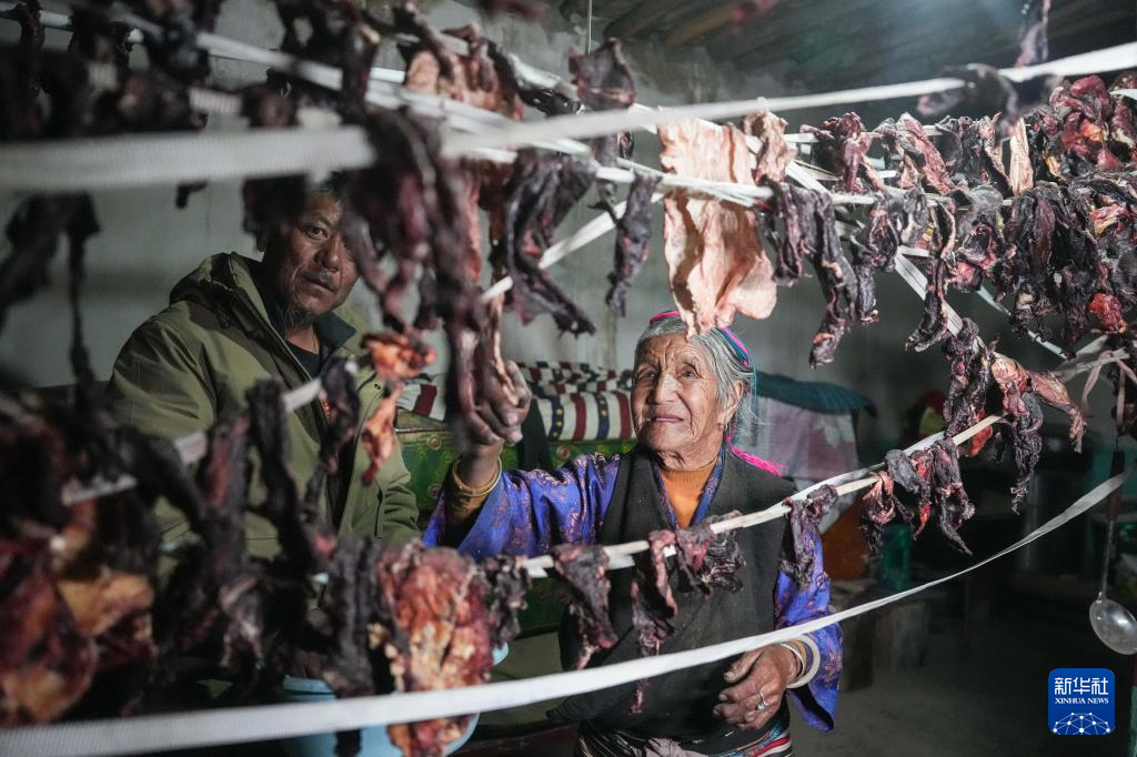 ??3月12日,格桑美多老人(右)拾取家里曬的風(fēng)干牛肉。新華社記者 晉美多吉 攝