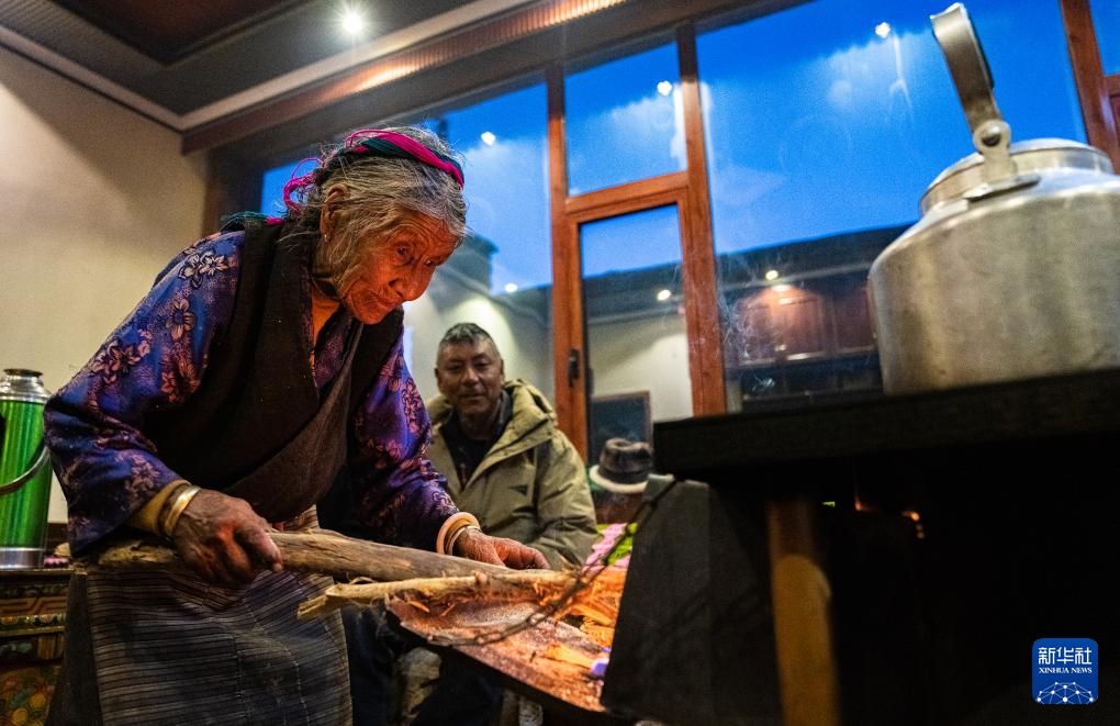 3月12日,格桑美多老人在家給火爐添柴。新華社記者 丁增尼達 攝