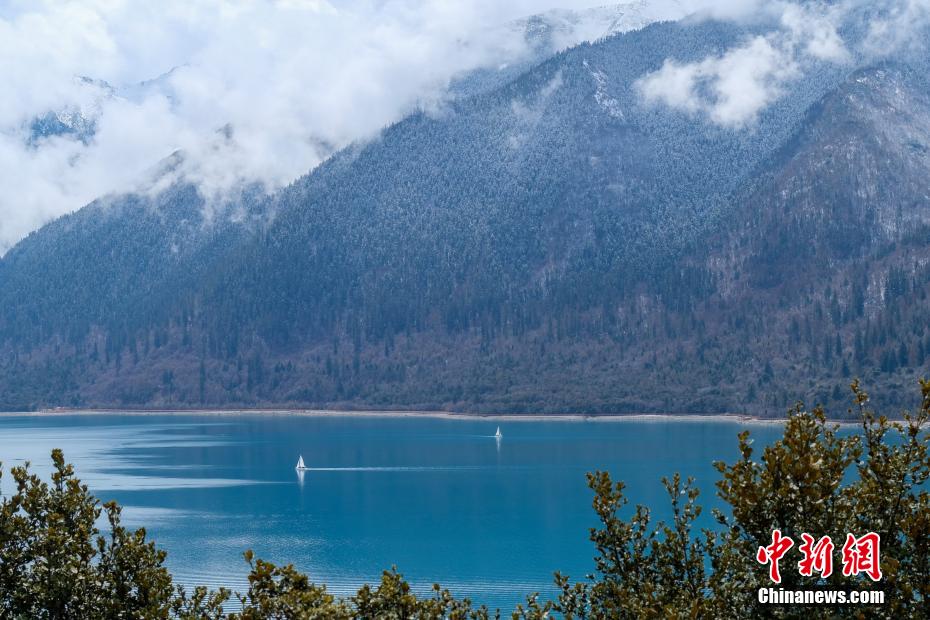 巴松錯(cuò)位于西藏林芝工布江達(dá)縣境內(nèi),地處巴河上游的高山峽谷中,是西藏首個(gè)自然風(fēng)景類國家5A級(jí)旅游景區(qū)。4月5日,巴松錯(cuò)迎來一場春雪,雪后四周原始森林猶如蒙上潔白面紗,湖面宛如一面藍(lán)寶石鑲嵌其中,風(fēng)光如畫。圖為4月5日,游客乘船游覽巴松錯(cuò)。中新社記者 江飛波 攝