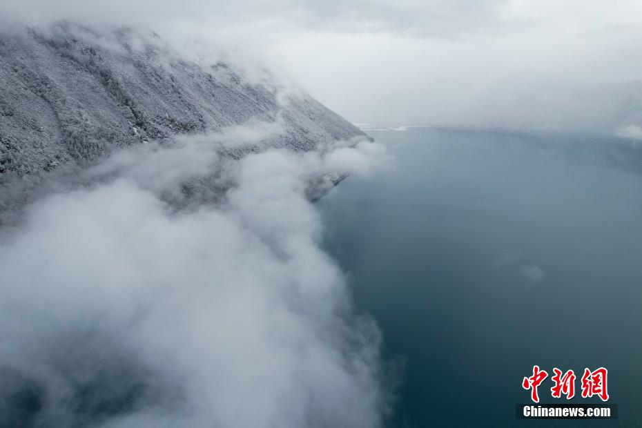 巴松錯(cuò)位于西藏林芝工布江達(dá)縣境內(nèi),地處巴河上游的高山峽谷中,是西藏首個(gè)自然風(fēng)景類國家5A級(jí)旅游景區(qū)。4月5日,巴松錯(cuò)迎來一場春雪,雪后四周原始森林猶如蒙上潔白面紗,湖面宛如一面藍(lán)寶石鑲嵌其中,風(fēng)光如畫。圖為4月5日,雪后初晴,云霧環(huán)繞巴松錯(cuò)。(無人機(jī)畫面)中新社記者 江飛波 攝