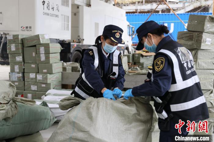 圖為聶拉木海關關員對出口貨物進行查驗。拉薩海關供圖