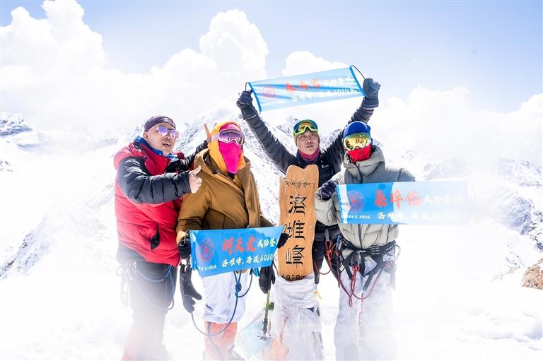 當(dāng)部分山友抵達(dá)洛堆峰一處近60度坡度冰面時(shí),太陽緩緩升起,金色的陽光照射在山友們身上,寒冷、缺氧時(shí)刻考驗(yàn)著每一個(gè)人,但大家邁著堅(jiān)定的步伐繼續(xù)攀登。經(jīng)過數(shù)小時(shí)的攀登,來自西藏民族大學(xué)體育學(xué)院的3名學(xué)生,最先沖頂成功。隨后,陸續(xù)有山友安全挺進(jìn)洛堆峰海拔6010紀(jì)念碑處。大家共同見證了雪山之巔的壯麗風(fēng)景。