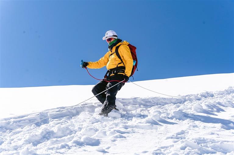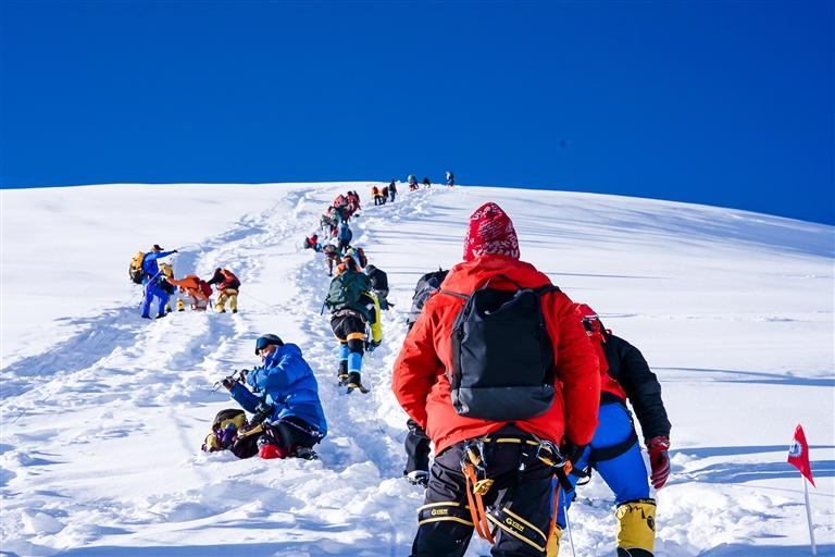 登頂?shù)哪且豢?,喜悅之情洋溢在每個(gè)人的臉上,大家紛紛開始拍照留念。第三次登頂?shù)纳接鸭玻y掩激動(dòng)地向記者分享了此次難忘的攀登經(jīng)歷。她提到,在沖頂前一日,教練提醒所有人,因近期頻繁降雪,加之粉雪的特性,今年的攀登路線難度大幅提升。盡管如此,這絲毫沒有削減她的熱情,反而讓她對(duì)3日的登頂充滿了期待。