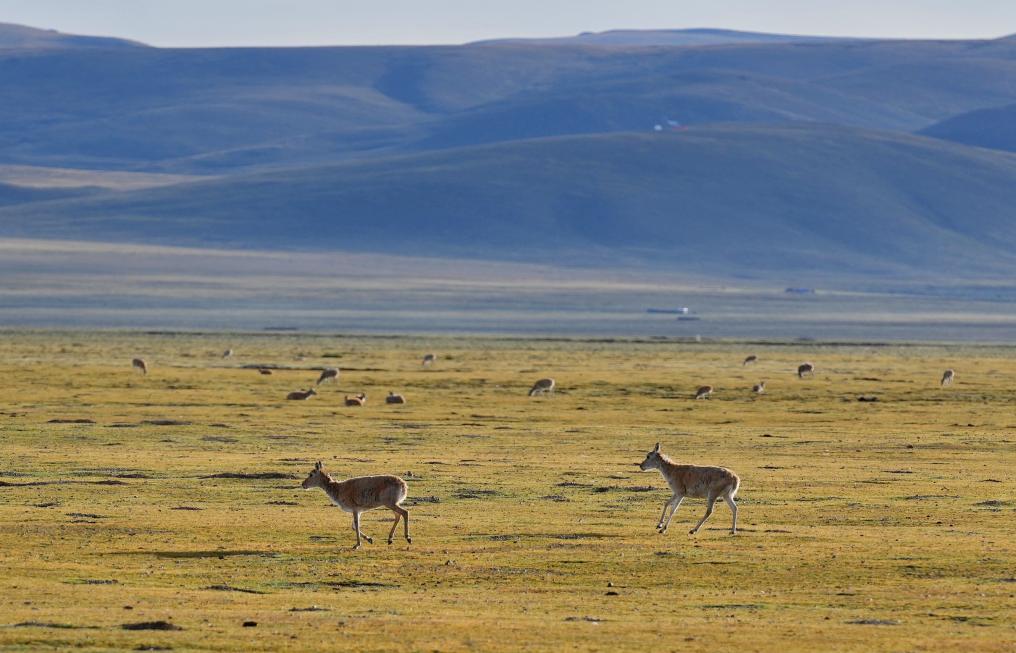 色林錯(cuò)國家級(jí)自然保護(hù)區(qū)那曲市申扎縣片區(qū)里的藏羚羊(2024年8月26日攝)。新華社記者 張汝鋒 攝