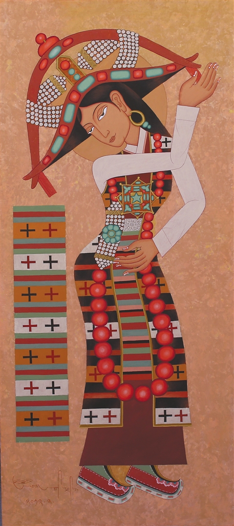 在昂?!皞鹘y(tǒng)當(dāng)隨時代”的藝術(shù)理念浸潤下,徒弟們總能在傳統(tǒng)與當(dāng)代的碰撞中找到獨(dú)特的表達(dá)坐標(biāo):來自日喀則的藝術(shù)家多吉次旺,早年被昂桑畫作中藏文元素與抽象色塊的融合所震撼。如今在拉薩創(chuàng)辦工作室的他,正將藏文書法的中鋒筆觸解構(gòu)為流動的視覺符號——烏金體的頓挫韻律幻化為色彩的潮涌,在畫布上重現(xiàn)古老史詩的“當(dāng)代心跳”;而主演《文成公主》實(shí)景劇的馮佳,這位四川傳媒大學(xué)表演系的畢業(yè)生,跟隨昂桑學(xué)畫四年,已能在《文成公主》系列中將唐卡礦物顏料的莊重與波普藝術(shù)的色塊切割并置,讓歷史人物既保有壁畫般的莊重感,又流淌著屬于時代的視覺節(jié)奏。