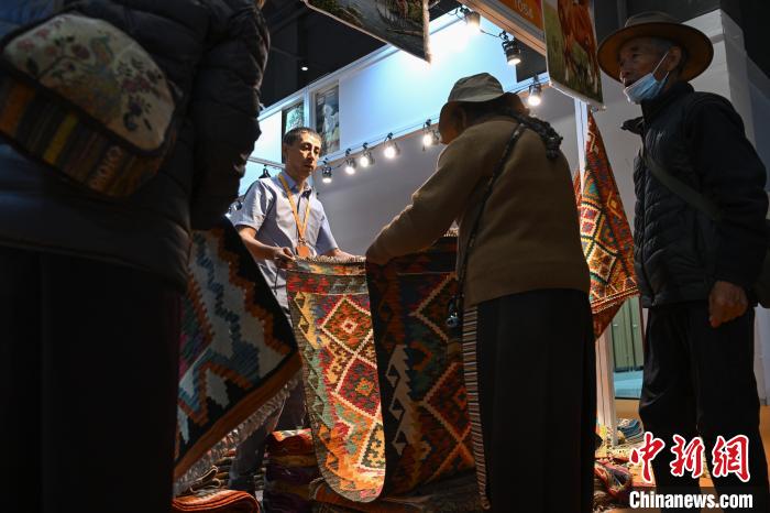 圖為拉薩進口商品展覽會現(xiàn)場,伊朗商人(左)向顧客介紹、推銷毛毯。中新社記者 貢嘎來松 攝