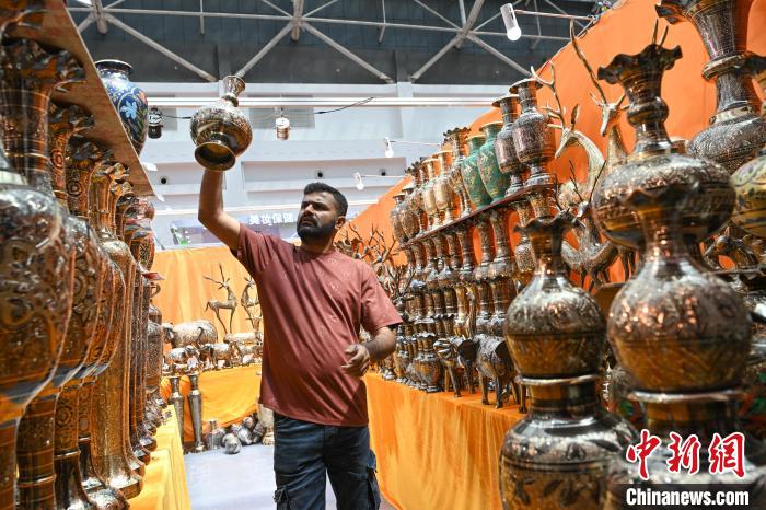 圖為拉薩進口商品展覽會現(xiàn)場,巴基斯坦商人在展會上擺放商品。中新社記者 貢嘎來松 攝