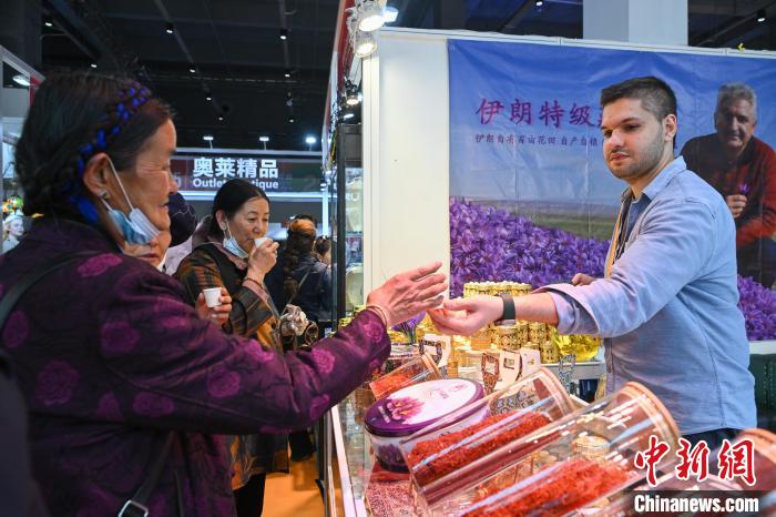 圖為拉薩進口商品展覽會現(xiàn)場,伊朗商人(右)向顧客品嘗藏紅花。中新社記者 貢嘎來松 攝