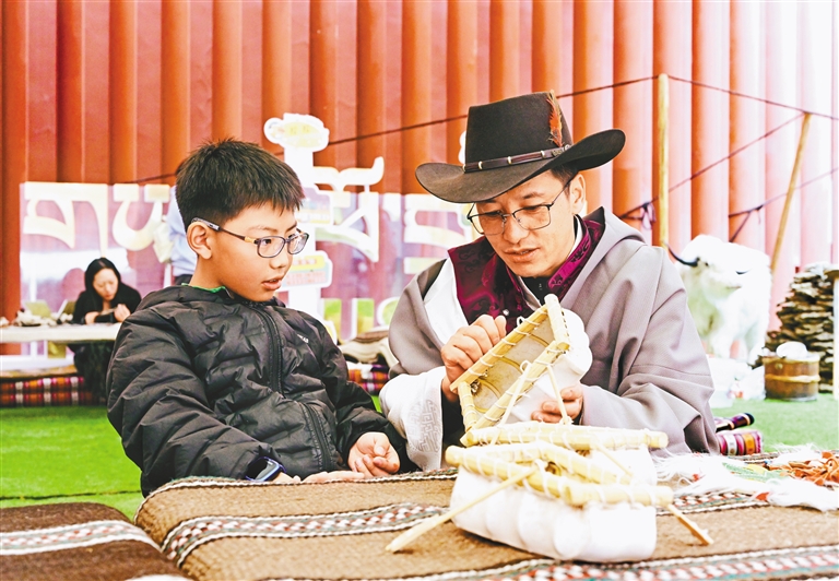 西藏牦牛博物館將牧區(qū)生活“搬”進展廳。黑帳篷內(nèi)飄出酥油茶香,觀眾盤坐氈毯體驗手工磨制糌粑。牧民手把手教授牦牛毛編織技藝,讓觀眾親身體驗粗糙的牦牛毛在指尖捻轉(zhuǎn)成繩結(jié)。此外,雕版拓印和牛皮船制作體驗區(qū)也備受關注。非遺傳承人現(xiàn)場演示古老的雕版印刷技藝,游客親手拓印吉祥圖案,帶走獨特的文化記憶。牛皮船的制作展示則讓觀眾近距離了解這一傳統(tǒng)水上交通工具的制作工藝,深刻感受藏族人民的生存智慧。