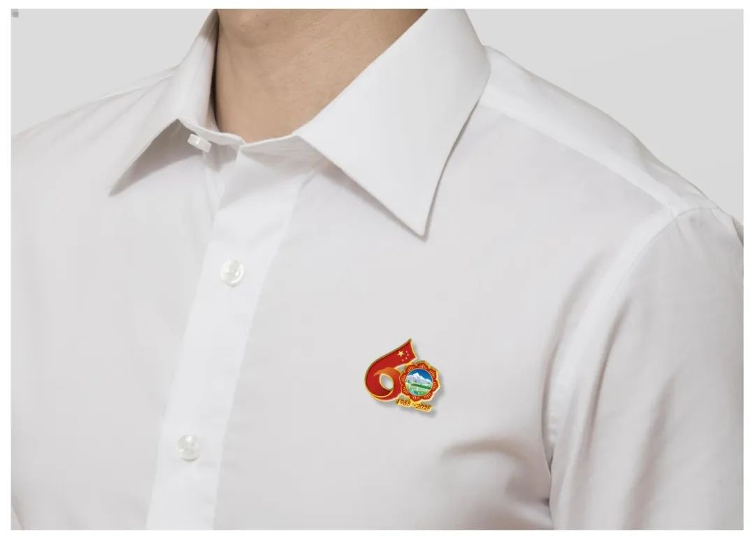 飄揚的紅旗飄帶象征著繁榮昌盛的祖國母親給予西藏堅定的關懷與呵護,使西藏在砥礪奮進的六十年中綻放出燦爛的格?;ǘ洹F渲?,西藏復興號、民居、風車、雪山、藏羚羊等當地風物也代表了西藏譜寫現代化建設新篇章。
