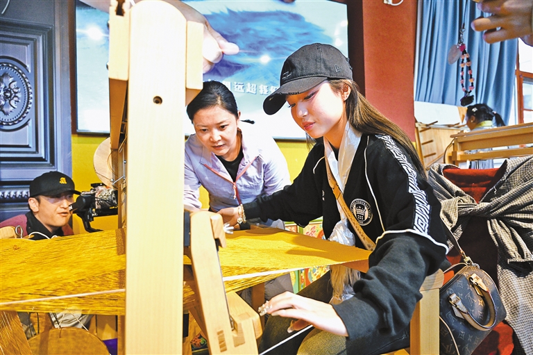 在江孜縣“阿佳格桑工坊”,工坊負責人阿佳格桑和江孜縣群團工作部黨組書記、部長央吉向剛到的日本游客獻上潔白的哈達,歡迎遠道而來的客人。走進工坊,游客們被精美的藏族氆氌技藝震撼,看著藏族婦女正在編織,便躍躍欲試。在央吉的帶領(lǐng)下,日本游客紛紛踏上編織機,有模有樣地學起了編織,豎起拇指稱贊不斷。
