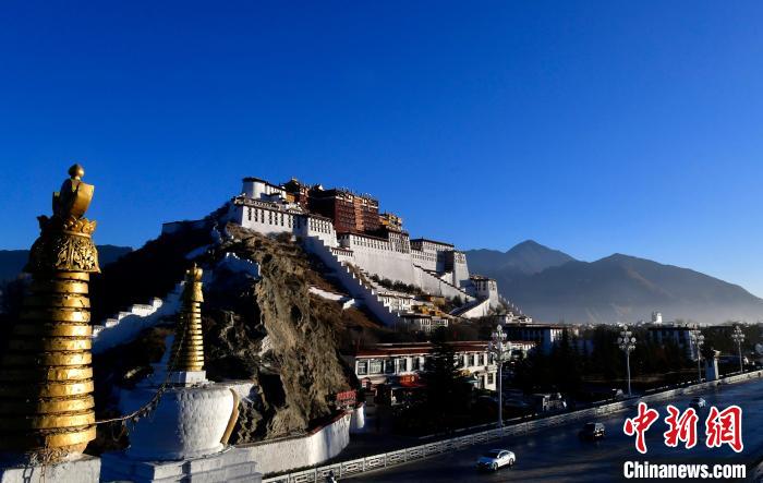 2025年1月1日,新年第一天,朝霞中的西藏拉薩布達(dá)拉宮。中新社記者 李林 攝
