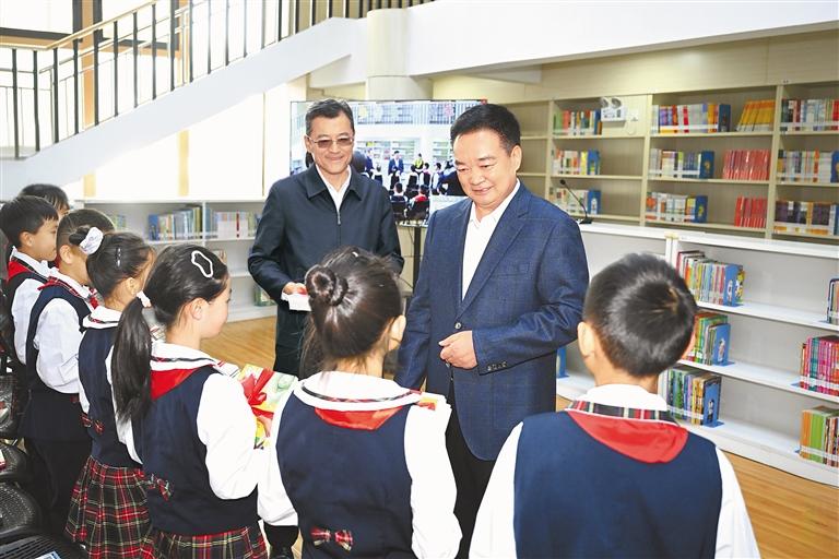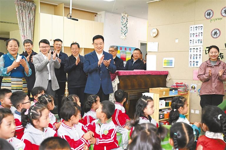 初夏,萬(wàn)物并秀,生機(jī)勃發(fā),拉薩市實(shí)驗(yàn)小學(xué)書聲瑯瑯。王君正走進(jìn)校園,察看學(xué)校環(huán)境,參觀自然、閱讀、書法、體育等教育成果展示,了解學(xué)校歷史沿革、建設(shè)發(fā)展、教育教學(xué)等情況。他指出,習(xí)近平總書記高度重視、親切關(guān)懷少年兒童和少先隊(duì)工作,多次參加少先隊(duì)活動(dòng),發(fā)表重要講話、作出重要指示。5月27日,習(xí)近平總書記致信祝賀中國(guó)少年先鋒隊(duì)第九次全國(guó)代表大會(huì)召開(kāi),殷切寄語(yǔ)廣大少年兒童,飽含著對(duì)大家的深切關(guān)愛(ài)。要加強(qiáng)愛(ài)國(guó)主義教育,講好思政課,著力講好黨的故事、革命的故事、英雄的故事,時(shí)刻把祖國(guó)和人民放在心中,不忘初心、童心向黨,從小聽(tīng)黨話、感黨恩、跟黨走;要積極推廣國(guó)家通用語(yǔ)言文字,把鑄牢中華民族共同體意識(shí)根植少年兒童心靈深處,引導(dǎo)他們爭(zhēng)做民族團(tuán)結(jié)的小石榴籽,爭(zhēng)當(dāng)學(xué)習(xí)和踐行社會(huì)主義核心價(jià)值觀的小模范。圖書館內(nèi),“紅領(lǐng)巾小書蟲”讀書分享活動(dòng)正在進(jìn)行,孩子們圍坐在一起,與定日縣長(zhǎng)所鄉(xiāng)完全小學(xué)學(xué)生視頻連線,共同分享喜歡的書籍,王君正認(rèn)真傾聽(tīng)、親切詢問(wèn),向孩子們贈(zèng)送書籍?!白鎳?guó)的未來(lái)和希望在你們身上,要熱愛(ài)祖國(guó)、好好學(xué)習(xí)、天天向上,從小培養(yǎng)良好的道德情操。”王君正鼓勵(lì)他們說(shuō),要多讀書、讀好書,從書中汲取智慧和營(yíng)養(yǎng),將來(lái)做對(duì)國(guó)家、對(duì)人民、對(duì)社會(huì)有用的人。