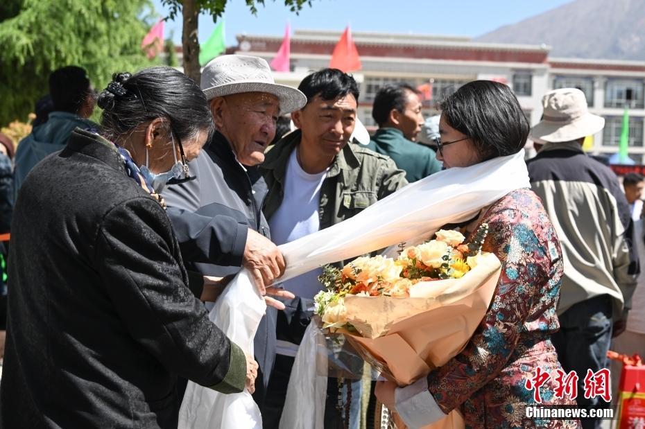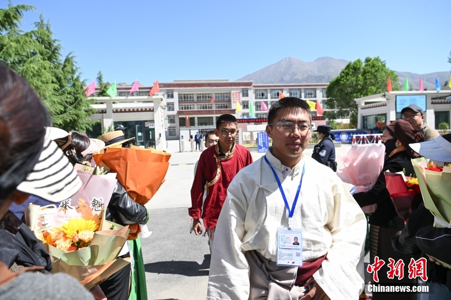 6月9日上午11時30分,西藏自治區(qū)2025年普通高考完成所有科目考試。圖為家長在拉薩市拉薩中學(xué)考點(diǎn)外為結(jié)束考試的孩子獻(xiàn)鮮花。中新社記者 李林 攝
