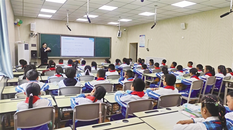 本次活動(dòng)以單課時(shí)科普課程為載體,聚焦“聲音是如何產(chǎn)生的”“聲音為什么會不同”“聲音是如何傳播的”“我們是如何聽到聲音的”四大核心問題,針對小學(xué)三至五年級學(xué)生不同的知識儲備,設(shè)計(jì)出“排簫音調(diào)實(shí)驗(yàn)”“鼓膜振動(dòng)模型”“八弦琴音色對比”“簡易擴(kuò)音器制作”“真空罩聲音衰減”5個(gè)生動(dòng)有趣的科學(xué)實(shí)驗(yàn),分層實(shí)施教學(xué),激發(fā)了學(xué)生們探索科學(xué)的濃厚興趣。