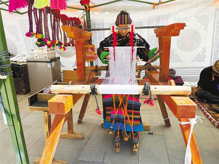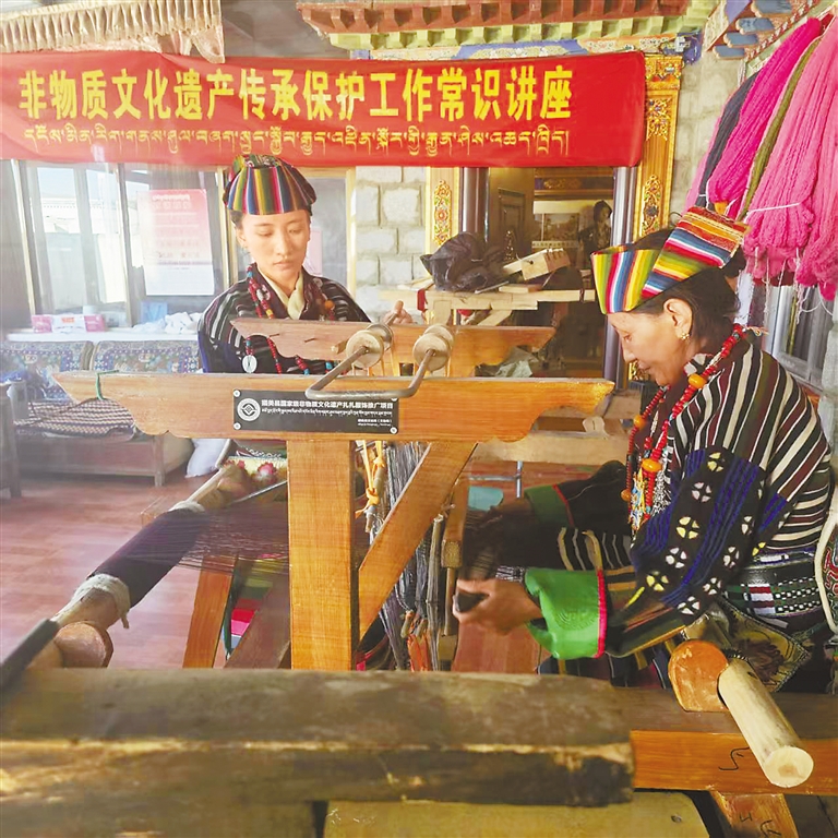 在措美縣非遺展示活動(dòng)現(xiàn)場,扎雜村村民在演示織氆氌。