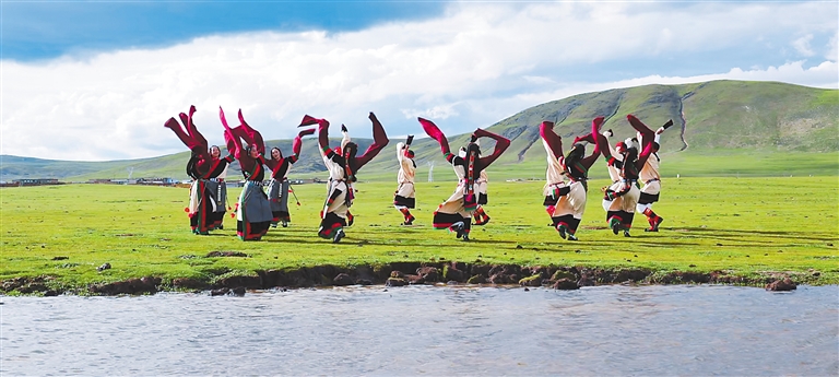 近年來,那曲文旅局以那曲傳統(tǒng)鍋莊舞展演為突破口,進一步推進那曲優(yōu)秀傳統(tǒng)文化創(chuàng)造性轉(zhuǎn)化和創(chuàng)新性發(fā)展,全力打響那曲鍋莊舞品牌?!D為那曲市群眾藝術鍋莊隊隊員在草原上跳鍋莊舞。(那曲市文旅局非遺處提供)
