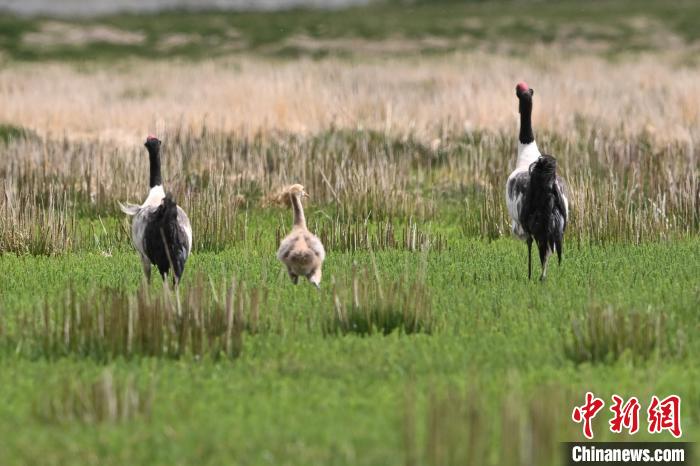 7月10日,在海拔4700米的西藏自治區(qū)那曲市申扎縣濕地里,黑頸鶴一家在悠閑覓食。黑頸鶴是中國國家一級重點保護野生動物,屬高原特有鶴類,主要棲息于海拔2500米至5000米的高原沼澤地、湖泊及河灘等濕地環(huán)境。每年四月起,成對的黑頸鶴陸續(xù)飛抵西藏自治區(qū)那曲市申扎縣,在此繁育后代。近年來,申扎縣持續(xù)加強生態(tài)修復,濕地面積擴大、水質改善,為黑頸鶴等珍稀物種提供了理想家園。中新社發(fā) 毛建軍 攝