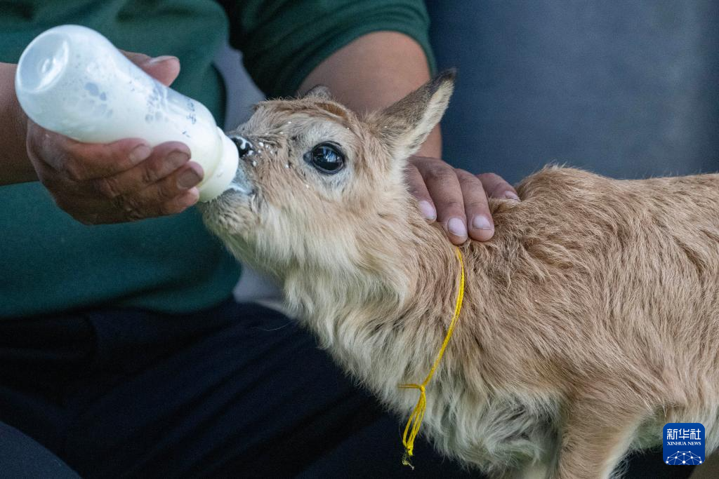 措羅木管理站站長(zhǎng)阿旺洛卓在給藏羚羊幼崽喂奶(7月16日攝)。新華社記者 姜帆 攝?