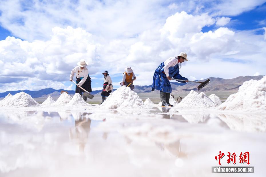 7月20日,在西藏阿里地區(qū)革吉縣鹽湖鄉(xiāng),民眾在鹽湖中采制粗鹽巴。一千多年前,阿里地區(qū)有50多家駐扎的鹽幫,將自然鹽用羊馱牛背邊放牧邊運(yùn)輸?shù)姆绞?,運(yùn)送到普蘭、日喀則、印度、尼泊爾等地,并用以物易物的方式換回青稞、磚茶、布料等日常生活所需的物品,從而孕育了遠(yuǎn)負(fù)盛名的“鹽羊古道”傳奇。近年來,當(dāng)?shù)亻_辦粗鹽巴加工廠、打造“鹽羊古道”旅游品牌等方式,使千年“鹽羊古道”煥發(fā)新生機(jī)。中新社記者 張祥毅 攝