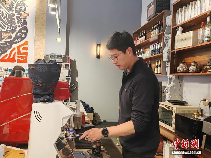 7月21日,劉博在他的店鋪內(nèi)操作咖啡機。中新社記者 陳建新 攝