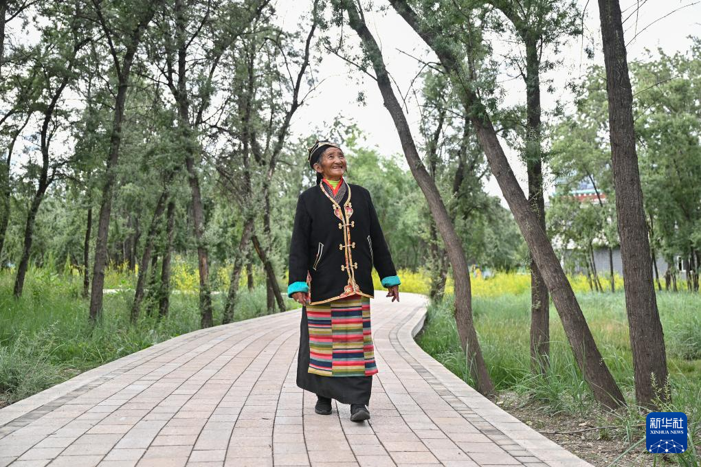 桑旦在隆子縣沙棘林生態(tài)公園內(nèi)散步。新華社記者 李鑫 攝