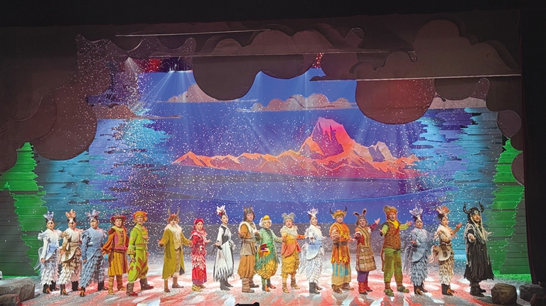 在《高原上的精靈》舞臺(tái)上,西藏傳統(tǒng)樂(lè)器的韻律與生態(tài)寓言相互交織。當(dāng)弦子、鷹笛和扎念琴的聲音劃破夜空時(shí),小觀眾們已沉浸其中。藏戲溫巴的藍(lán)面具在聚光燈下浮現(xiàn),藏戲特有的說(shuō)唱調(diào)式如雪山融水般流淌……《高原上的精靈》以80分鐘的音樂(lè)劇形式突破傳統(tǒng)話(huà)劇的敘事框架,這種形式選擇源于深刻的兒童心理洞察——音樂(lè)劇特有的歌舞敘事能持續(xù)刺激視覺(jué)與聽(tīng)覺(jué)神經(jīng),避免低齡觀眾對(duì)純對(duì)白場(chǎng)景產(chǎn)生倦怠感。