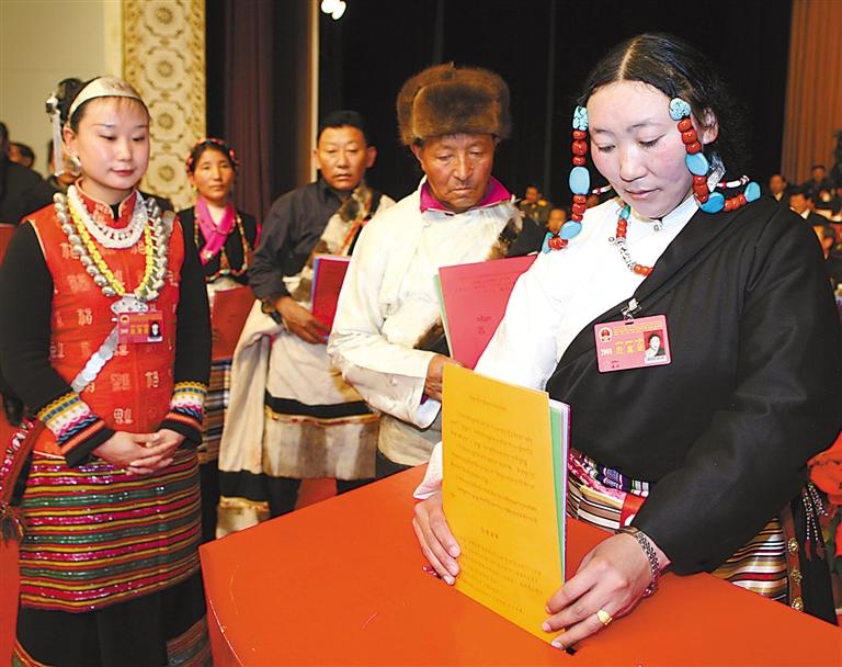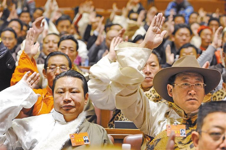 在舊西藏,占總?cè)丝诓坏?%的三大領(lǐng)主(官家、貴族和寺院上層僧侶)占有全部生產(chǎn)資料,而占總?cè)丝?5%以上的農(nóng)奴和奴隸沒(méi)有人身自由。西藏民主改革特別是西藏自治區(qū)成立以來(lái),民族區(qū)域自治制度得到堅(jiān)決貫徹,各族人民參與民主政治建設(shè)的熱情持續(xù)高漲:農(nóng)奴的后代當(dāng)選人大代表,通過(guò)人民代表大會(huì)制度參與國(guó)家治理;截至目前,全區(qū)四級(jí)人大代表42000余人中,藏族和其他少數(shù)民族約占89%;門巴、珞巴等人口不足萬(wàn)人的民族,在全國(guó)及西藏人大均有代表——雪域高原各族兒女依法行使民主權(quán)利,真正成為命運(yùn)的主宰者。