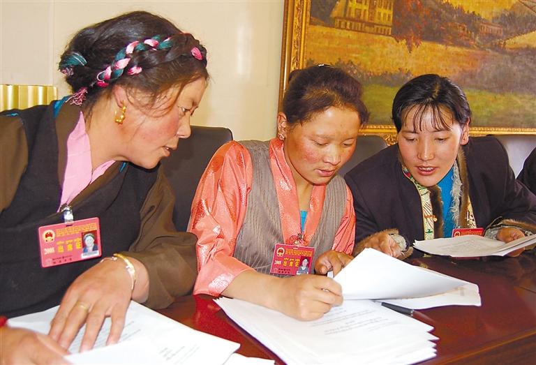 圖為西藏自治區(qū)九屆人大一次會(huì)議期間,來(lái)自拉薩市的格桑卓嘎、洛桑卓嘎、梅朵卓瑪三位代表一起審議政府工作報(bào)告(2008年攝)。