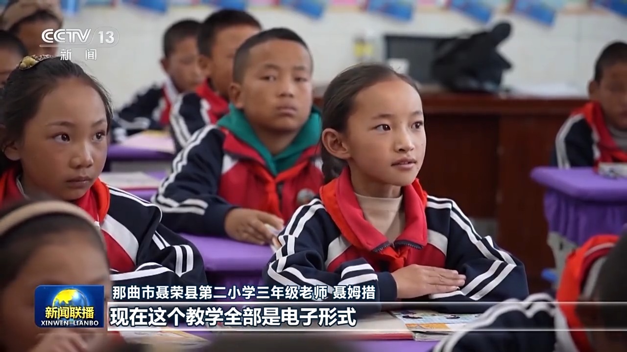 那曲市聶榮縣第二小學三年級老師 聶姆措:變化特別大,以前鄉(xiāng)鎮(zhèn)里面都是帳篷學校,黑板就是這么小的一個木板,冬天帳篷里面的話,手腳都是凍著的?,F(xiàn)在這個教學全部是電子形式,條件特別好。