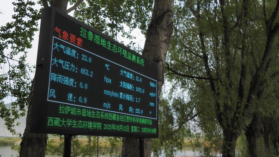 拉魯濕地國家級自然保護區(qū)南門內(nèi)的生態(tài)環(huán)境監(jiān)測系統(tǒng)顯示屏,實時顯示濕地內(nèi)的氣象要素、土壤和水環(huán)境、植被指數(shù)等數(shù)據(jù)。新華社記者 黃智琪 攝