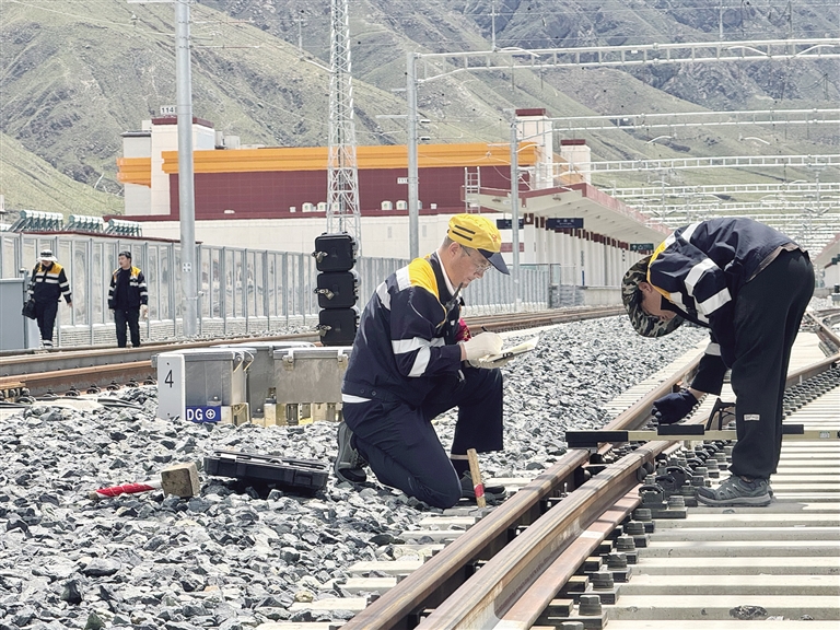 7月29日14時(shí)30分,拉林鐵路山南站,馬琳一手持道尺、一手握打號(hào)筆,一步一彎腰仔細(xì)檢查線路,額頭上沁滿的汗珠在高原陽(yáng)光下熠熠生輝。這位已在青藏鐵路線上扎根29年的老線路工,用指腹反復(fù)摩挲著滾燙的鋼軌邊緣——這是他與鐵路對(duì)話的特殊方式。