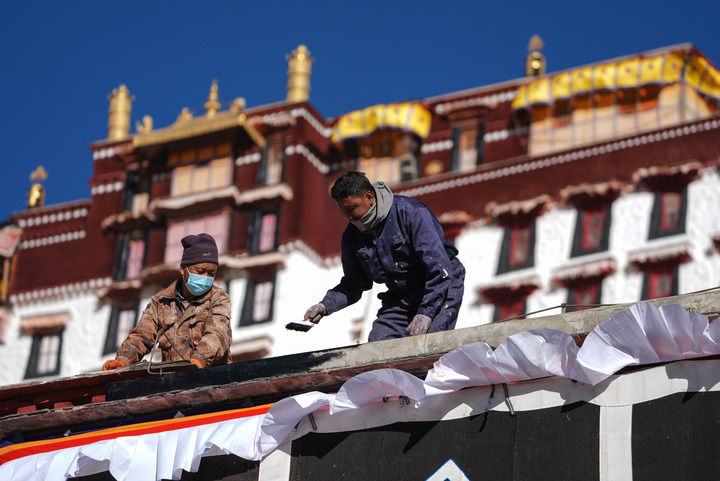 布達(dá)拉宮管理處維修科工作人員在粉刷墻體(2024年12月4日攝)。新華社記者 晉美多吉 攝